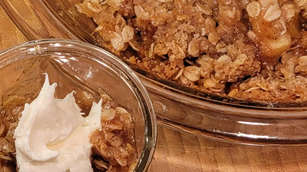 Move mixture into pie dish, top with oat topping and stick in the oven for 15 minutes on 350 degrees.